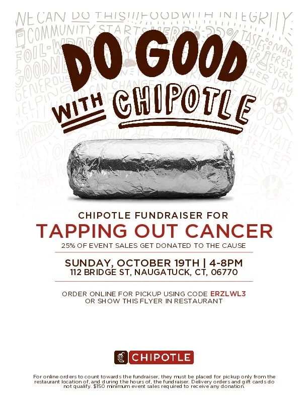 Join us at the Naugatuck Chipotle on October 19th from 4-8PM! A portion of all sales that day will go directly to help fight cancer—eat good, do good!”